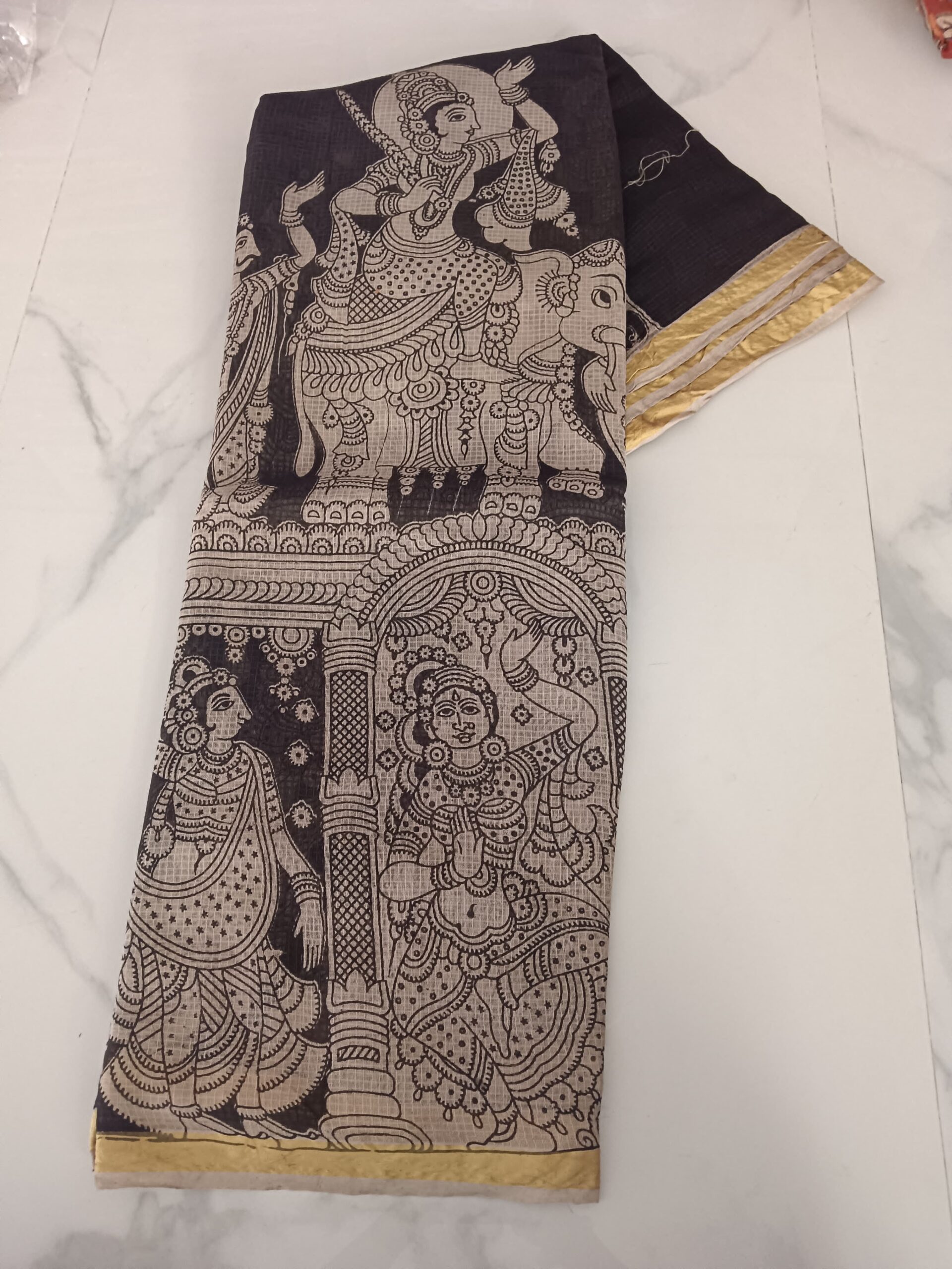 Dramatic black pure cotton kalamkari saree featuring detailed beige goddess figures with ornate jewellery, temple pillars and classical poses. Monochrome kalamkari artistry at its finest. A bold and cultural statement piece. Running blouse included.