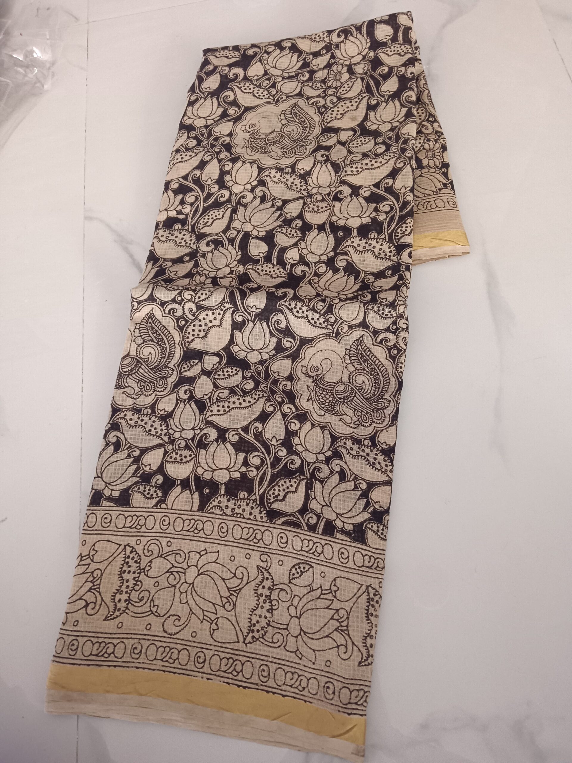 Premium black pure cotton kalamkari saree with all-over cream lotus flowers, buds and peacock motifs. Simple beige kalamkari paisley pallu border. A refined and classic design with elegant black and cream contrast. Running blouse included.