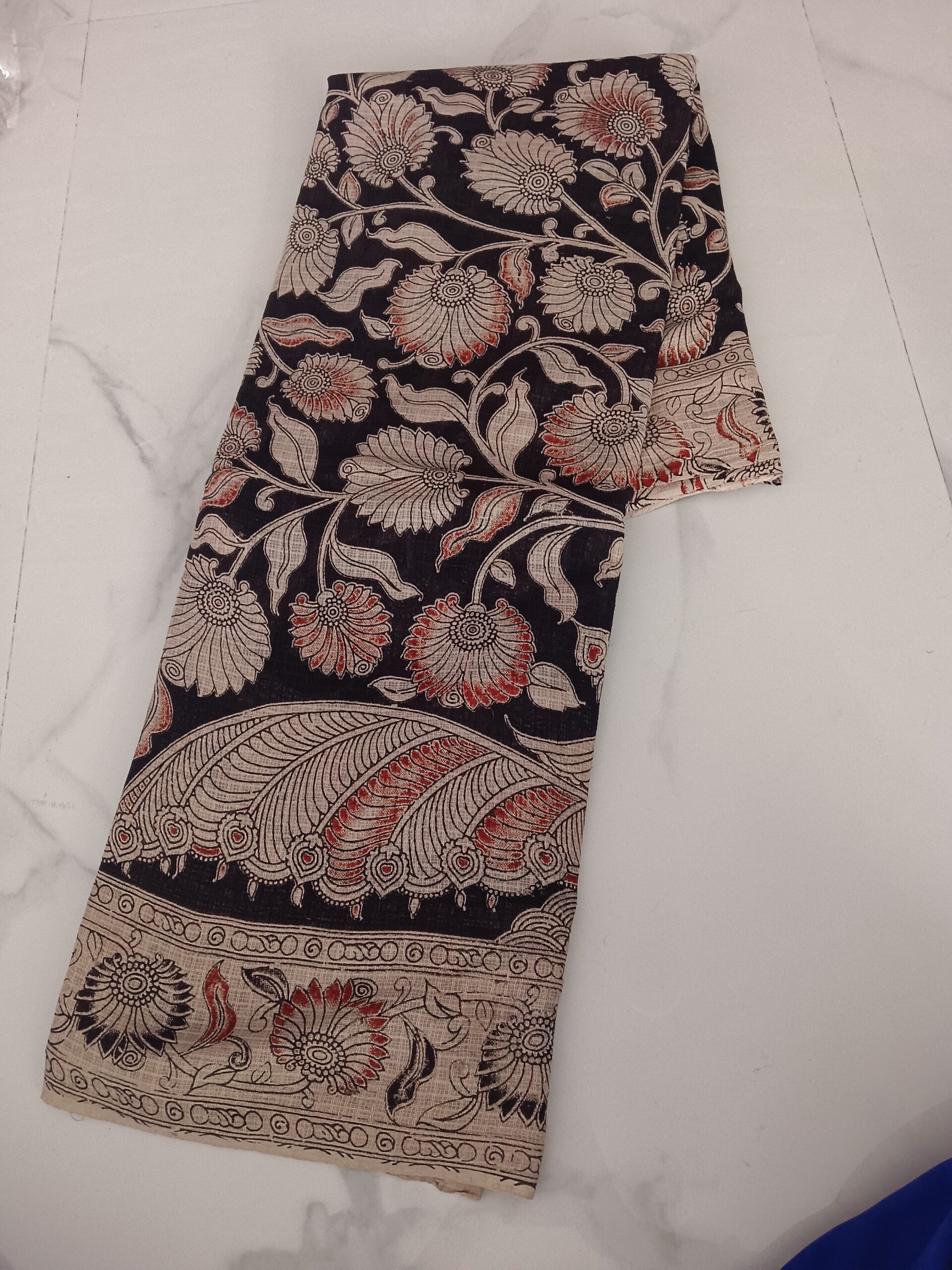 Rich black pure cotton kalamkari saree with cream and red sunflower and chrysanthemum flowers on flowing vines. Wide kalamkari peacock feather pallu border in beige. Bold floral design with strong contrast. Running blouse included.