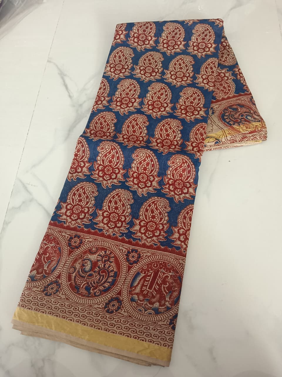 Deep blue pure cotton kalamkari saree with all-over bold red and cream paisley prints. Cream kalamkari pallu featuring peacock and elephant medallion panels. Rich and vibrant, a premium festive piece. Running blouse included.