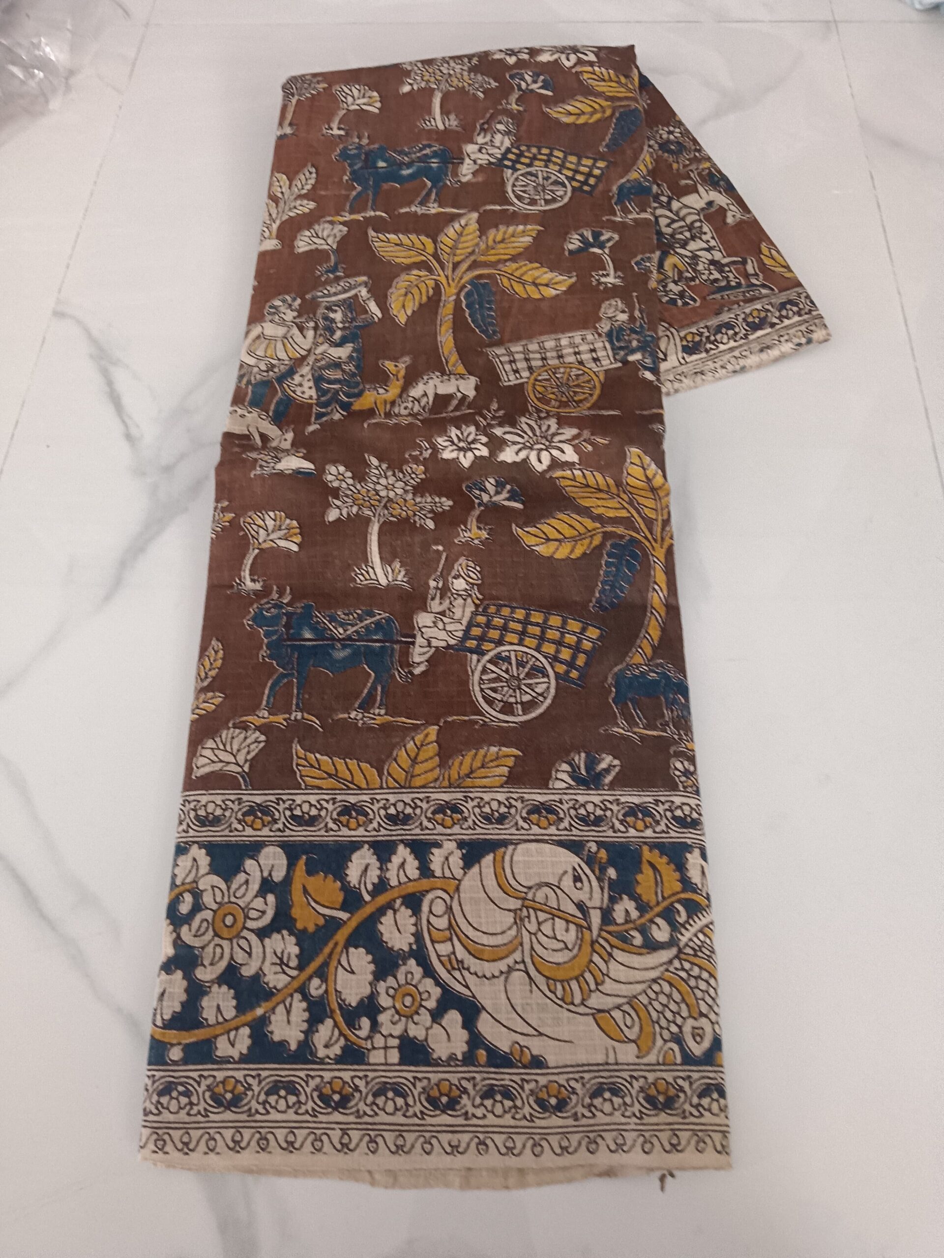 Earthy brown pure cotton kalamkari saree featuring multicolour village life scenes with bullock carts, tribal figures, trees and daily life in blue, gold and white. Vibrant kalamkari peacock pallu border. Running blouse included.