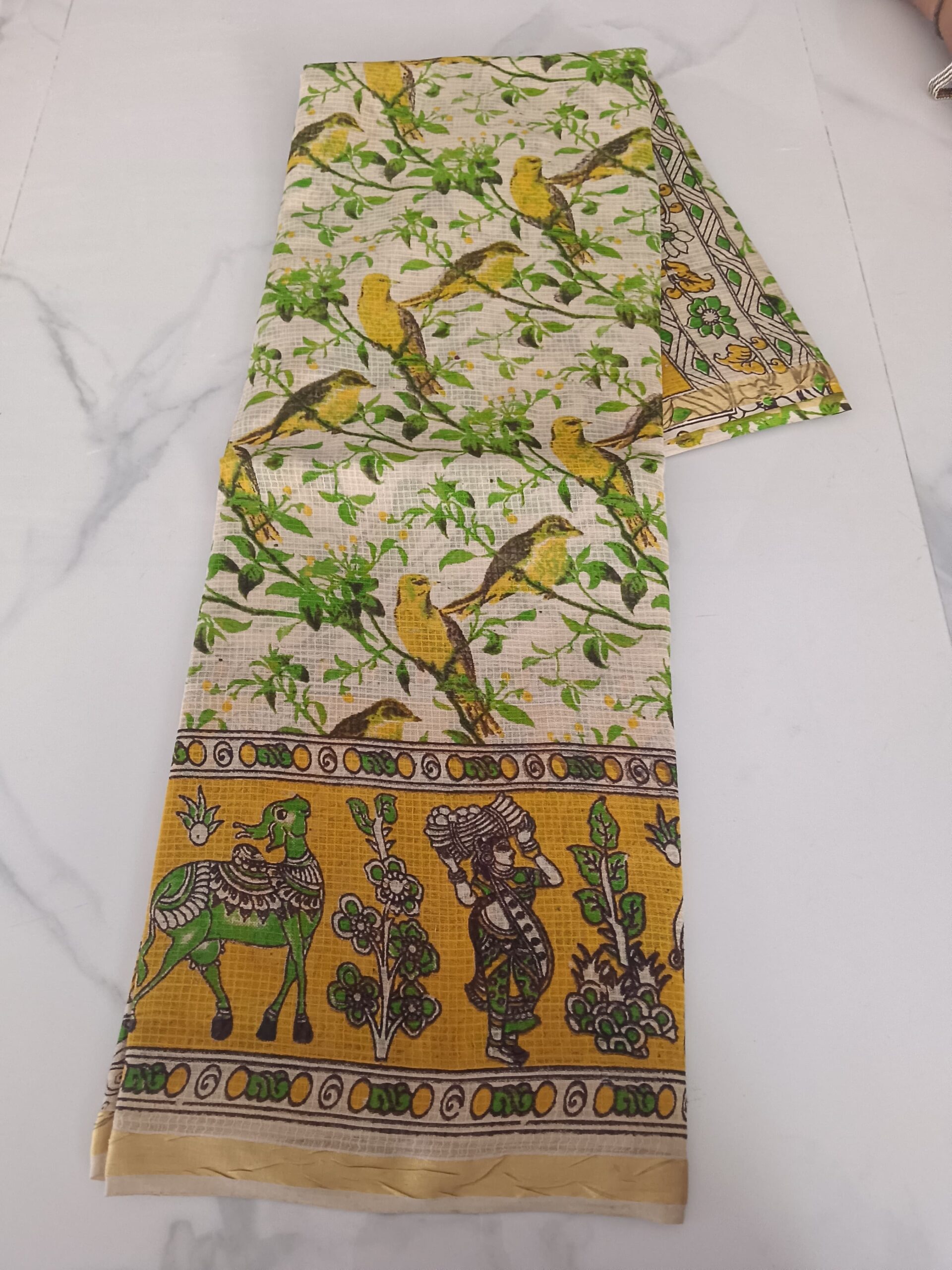 Light cream pure cotton kalamkari saree with realistic yellow and green birds perched on green leafy branches. Golden mustard pallu with village life scene featuring a decorated elephant and tribal figure. Unique nature-inspired design. Running blouse included.