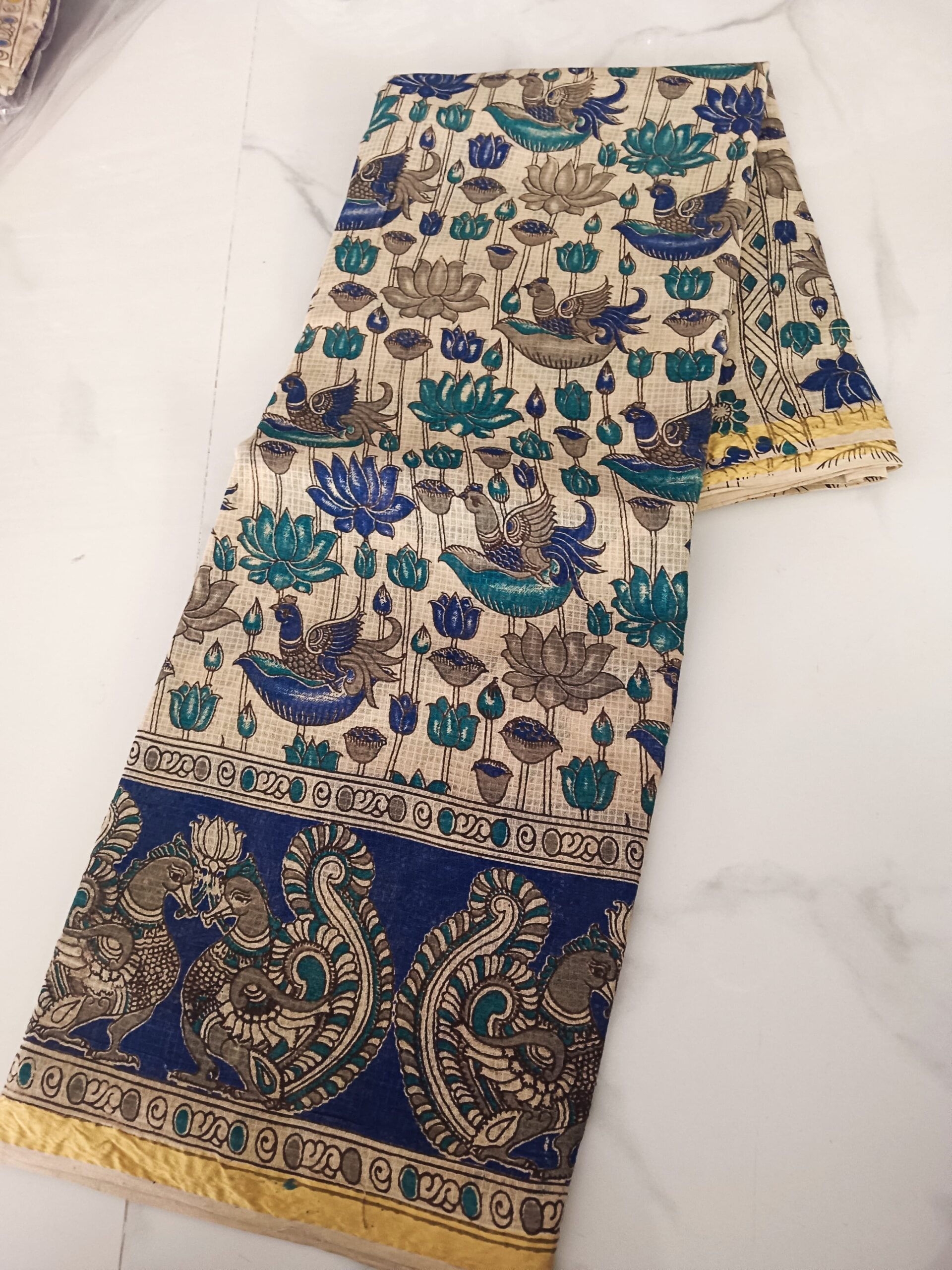Soft cream pure cotton kalamkari saree with blue, teal and beige lotus flowers and ducks on water stems. Bold navy blue kalamkari pallu with Yali and phoenix motifs. Fresh and vibrant with a heritage border. Running blouse included.