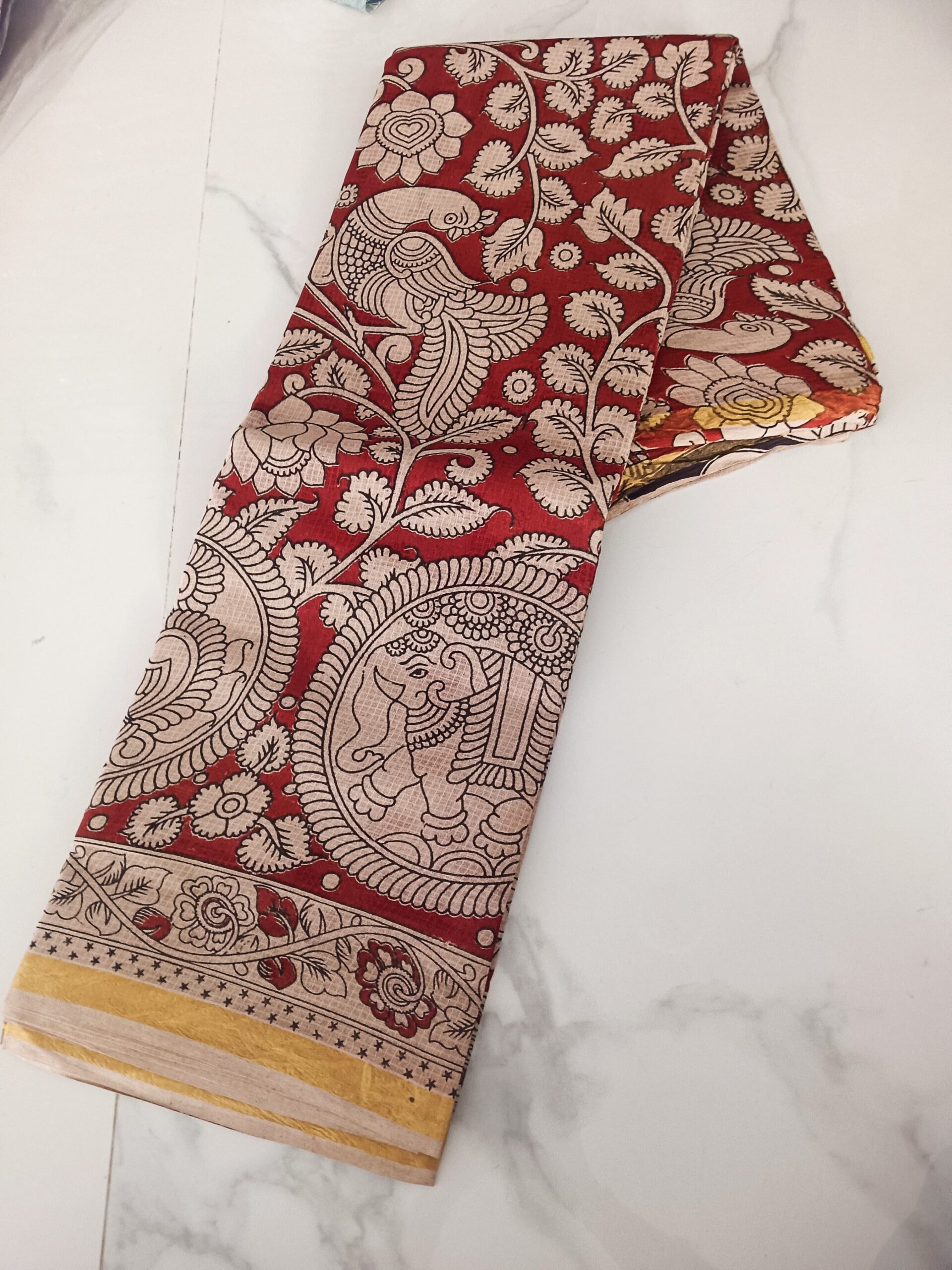 Deep maroon pure cotton kalamkari saree with all-over cream floral vines and parrots, featuring a large circular elephant medallion at the pallu. Decorative kalamkari flower border. Elegant and richly detailed. Running blouse included.