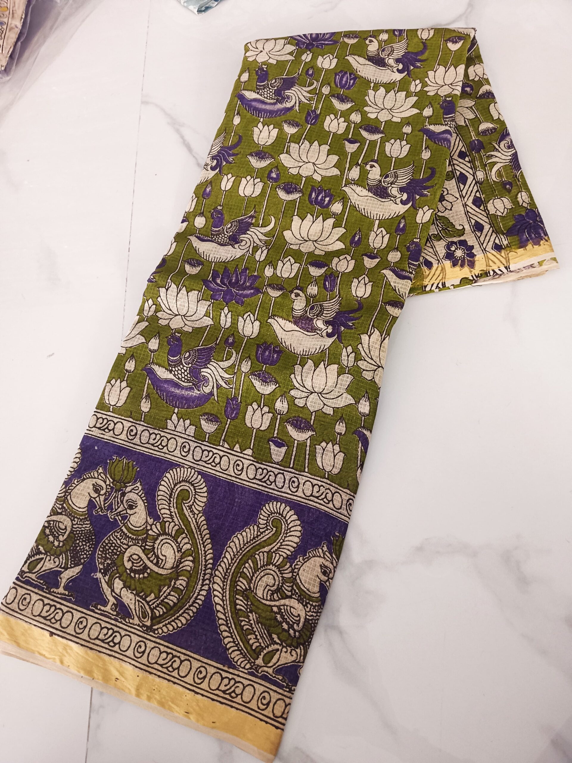 Earthy olive green pure cotton kalamkari saree with white lotus flowers and purple birds and ducks in the water. Purple kalamkari pallu border with Yali motifs. A refreshing and unique colour combination. Running blouse included.